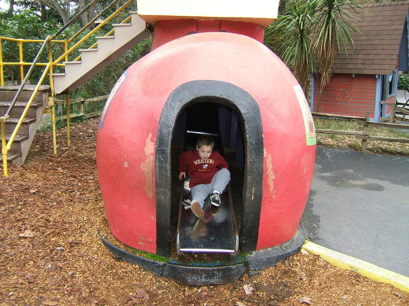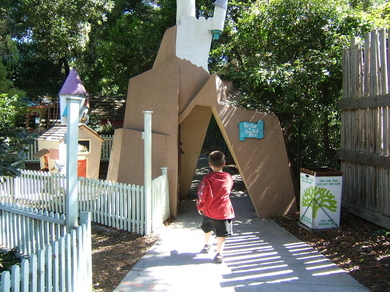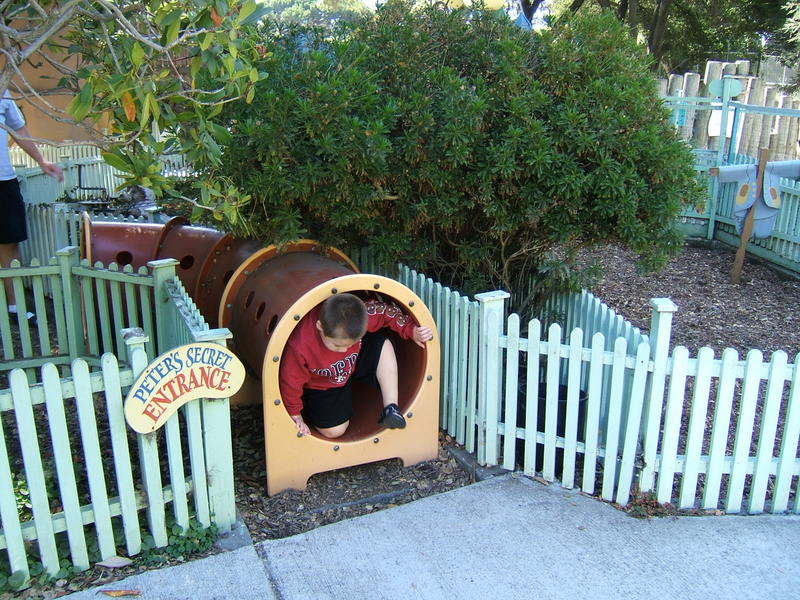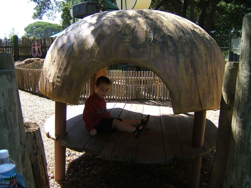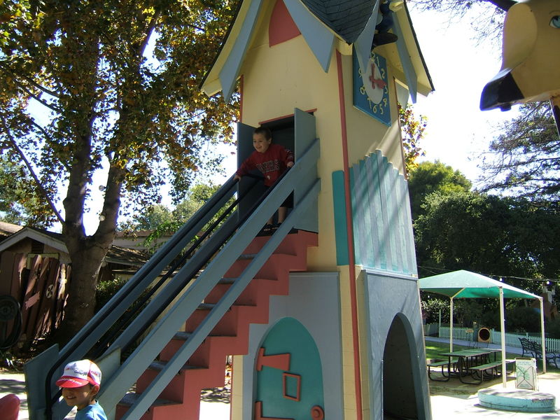 (Posted 12/21/05) Taken Sept 5, 2005. Alex's first visit to Children's Fairyland in Oakland. Taking a ride on Noah's Ark. Considering going down the clock tower slide. Saying hi to the dragon at the entrance. Trying out Peter Rabbit's secret tunnel. Taking a break from the hot African sun. I didn't think my tummy was that big! Taking a ride on the newly refurbished train ride with da-da. Laughing at us from the top of the "kids only" building when we wanted him to come down.