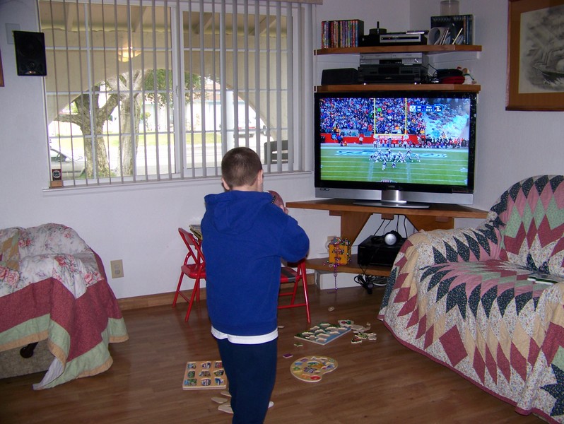 (Posted 1/27/08) Taken 1/20/2008. Alex getting into the spirit of the NFL playoffs. Aunt Julie and Uncle Eric came over to see Alex and watch some football. Alex checking out his new bopper toy.