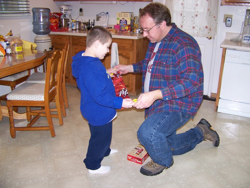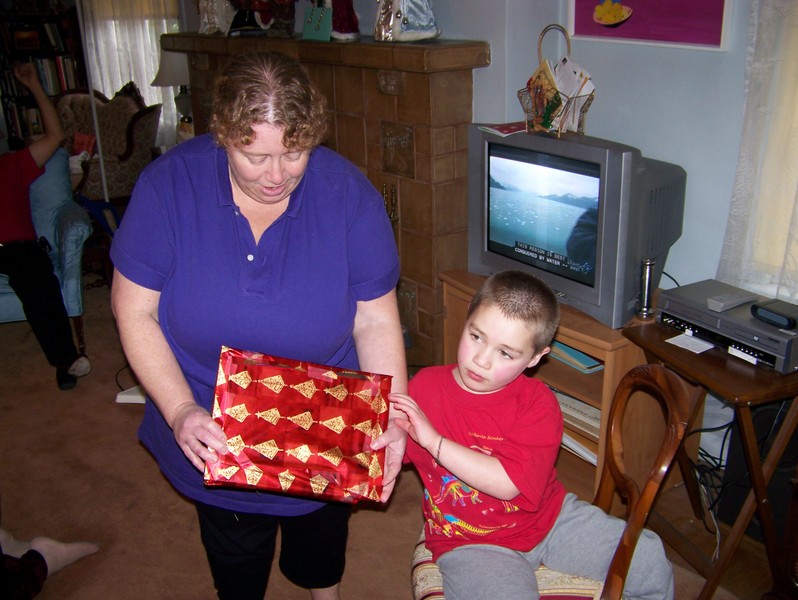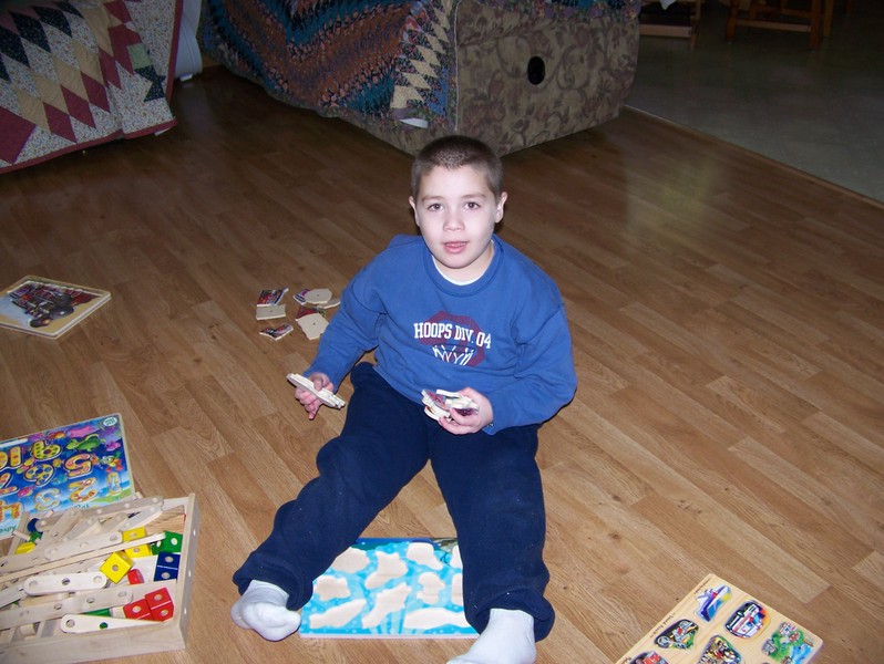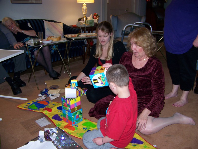 (Posted 1/27/08) Taken 1/18/2008. Alex opening some of his birthday presents. These were educational puzzles from Alex' Great-grandma Tootie.