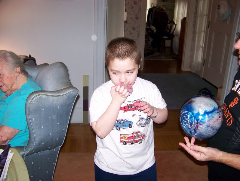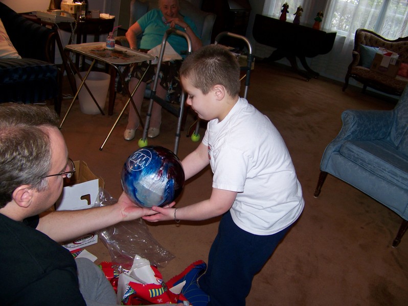 (Posted 1/27/08) Taken 12/29/2007. We had a make-up Christmas celebration at Jeff's grandparents' house in Berkeley. (Alex had been sick on Christmas Day.) Alex got his first bowling ball so that he and dada can go bowling on Sundays.