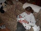 (Posted 3/9/02) Looking cute, checking out the mobile, sitting up in the rocking chair, trying to grab the TV remote, stealing dad's spot in bed, and getting attacked by giant stuffed duckie.