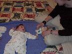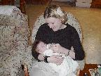 (Posted 4/8/02) March 12--Chrissy came out in the late afternoon to get some one-on-one time with her new nephew. She helped us feed him and give him a bath. And then she played peekaboo with the little guy. Lori got a kick out of it because it seems Chrissy and I play peekaboo the exact same way, without having talked about it or anything! We must have both learned it from our mom or grandma when we were little ourselves.